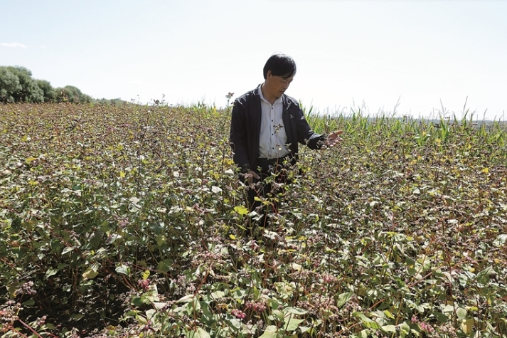 时下,会宁县种植的荞麦籽粒饱满,丰收在望。图为会宁县杨崖集镇姚坡村村民在察看荞麦长势。 常琦彪 摄