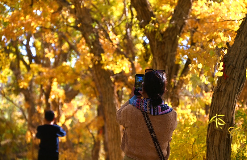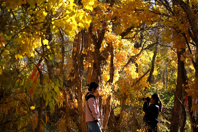 金秋十月,位于甘肃省敦煌市莫高镇的一片胡杨林被秋色浸润,宛如油画,分外迷人,吸引游客前来打卡拍照。(张晓亮 王明妍)
