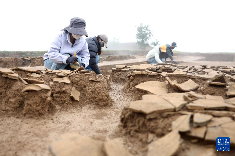 10月15日,在甘肃省陇南市礼县四角坪遗址考古发掘现场,四角坪遗址考古领队、甘肃省文物考古研究所副研究员侯红伟(右二)和考古工作人员探讨一处排水设施遗迹。新华社记者 郎兵兵 摄