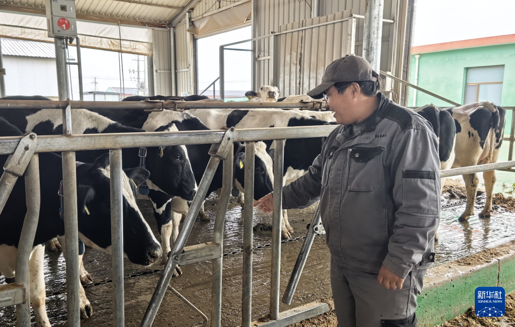 甘肃佳秉运牧业有限公司场长李雨蔚查看奶牛饲养情况。新华社记者李杰 摄