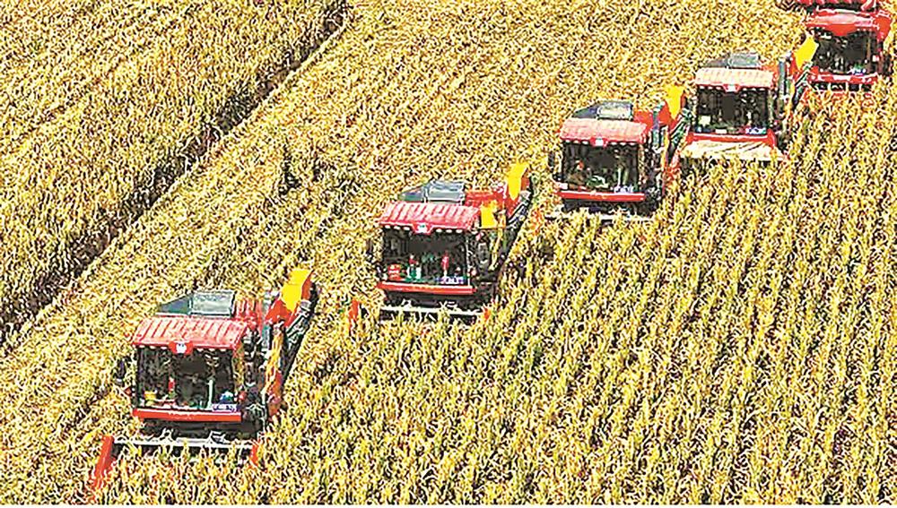 秋收时节,甘州区沙井镇南湾村华瑞恒祥制种玉米种植基地里,大型玉米联合收获机进行收获作业。 (记者 王 将 摄)