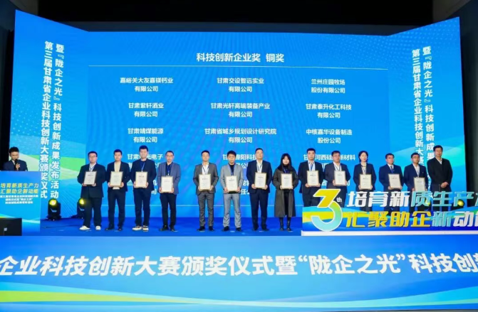 10月14日,第三届甘肃省企业科技创新大赛颁奖仪式暨“陇企之光”科技创新成果发布活动在甘肃科技馆举行。作为甘肃乳制品行业领军企业,庄园股份凭借在乳制品全产业链的科技创新实力及产业转化成效,荣获“科技创新企业铜奖”,申报的《西北传统特色食品在乳制品中的创新应用》项目获“科技创新成果优秀奖”。