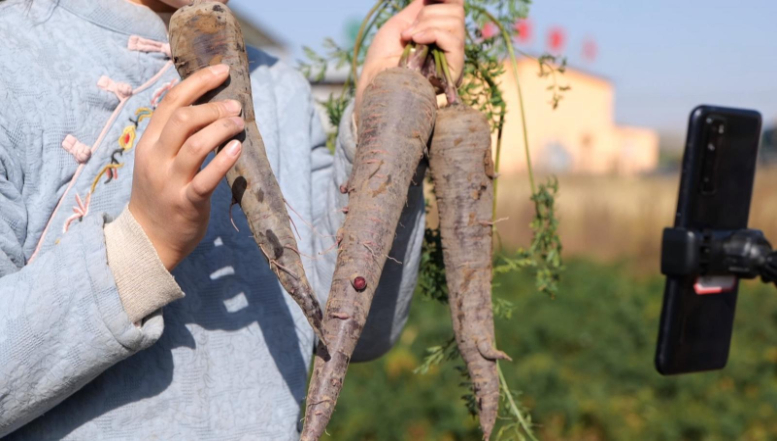 地标农产品成“网红”,订单排到地头。在公司直播基地,主播正对着镜头展示产品,屏幕上订单提示音此起彼伏。据了解,今年该公司共种植了800多亩胡萝卜,涵盖黄、红、紫等多个品种,亩产可达3000公斤左右,目前已经销售了200多亩地的产量,已下订单还有300亩地的产量。