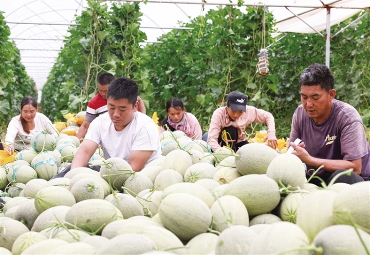 金秋时节,金塔县鼎新镇生态健康设施瓜菜产业园喜迎丰收,工作人员精准采收、分拣、套网、装箱,各环节高效衔接,叉车转运有序,满载成果的货车整装待发,现场一片繁忙景象。