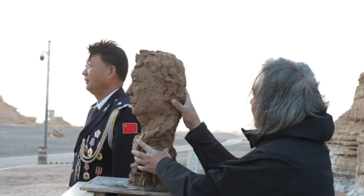 在雅丹派出所前,吴为山拿起泥土,为原雅丹派出所所长李生寿现场塑像。李生寿扎根大漠二十余载,用忠诚与担当书写着基层民警的初心使命,先后荣获 “全国公安系统二级英模”“全国最美基层民警” 等荣誉称号。吴为山将西方写实技巧与中国传统雕塑的写意神韵相融,精准捕捉李生寿眉宇间的刚毅与温和。