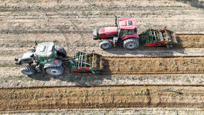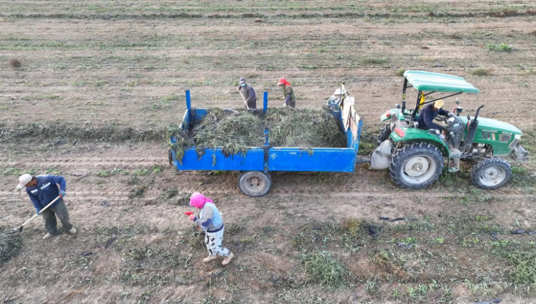 金秋十月,板蓝根迎来了采收的黄金时节。连日来,在金塔县东坝镇健康农业中药材产业园板蓝根种植基地,一台大型拖拉机正穿梭在田间,伴随着轰鸣声开展板蓝根的打叶作业。在基地的另一处采收区,四台大型采挖机械整齐排列,随着机械臂的精准运作,一垄垄饱满的板蓝根根茎破土而出,工人们熟练地对刚出土的板蓝根进行抖茎去土、分拣去杂,采收现场一派丰收热闹的景象。