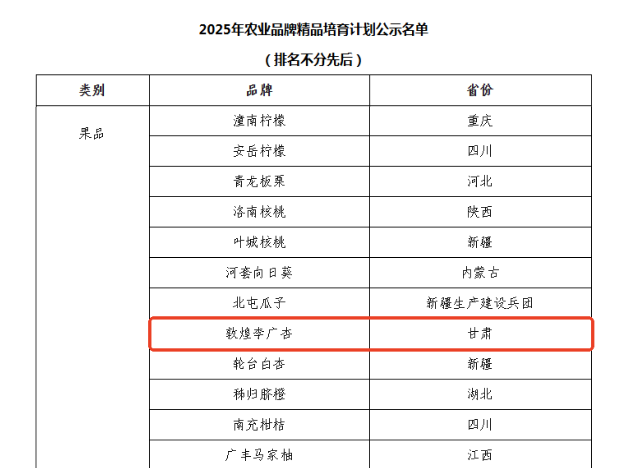 近日,农业农村部2025年农业品牌精品培育计划名单近日公示,敦煌李广杏成功入选,成为全国94个入选的区域公用品牌之一。