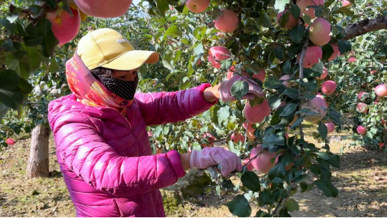 青山村村委会主任张多斌介绍,今年全村苹果种植面积稳定在300余亩,亩产达5000-6000斤,预计亩均产值约一万多元。在苹果产业稳步发展的同时,村里还积极推动种植结构多元化,新增蔬菜、葡萄等经济作物约100亩,逐步改变以往单一依赖苹果的种植模式,为村集体经济发展注入新活力。