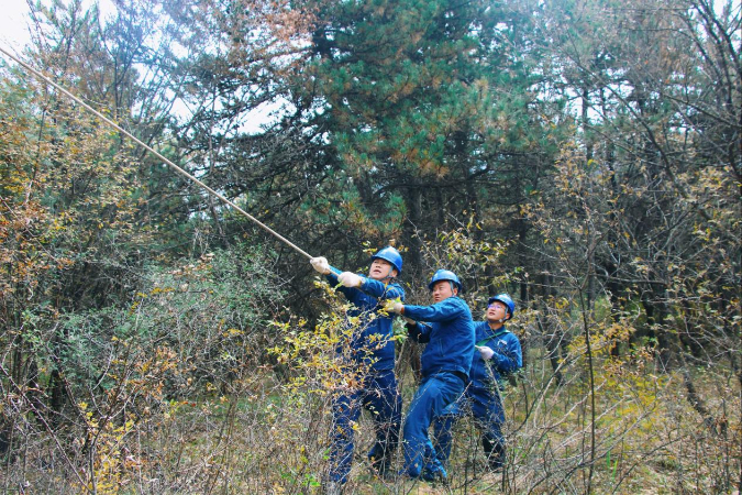 及时清理树障是保障线路安全与林区防火的关键。巡检中发现枯枝距导线不足2米时,队员们立即启动清理作业。一人在下方扶稳树干防止倾倒,另一人踮脚站稳后小心翼翼修剪枝条。剪下的枯枝统一归拢至远离线路的空地,避免遗留火种。遇到较粗的枯木,则用绳子固定后分段砍伐,全程保持与线路的安全距离。仅一上午,便清理4处树障隐患,为线路安全运行扫清障碍。