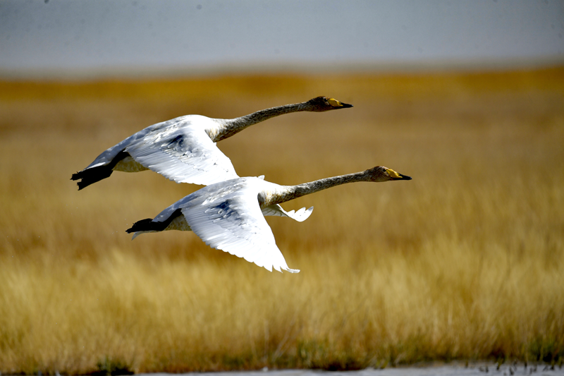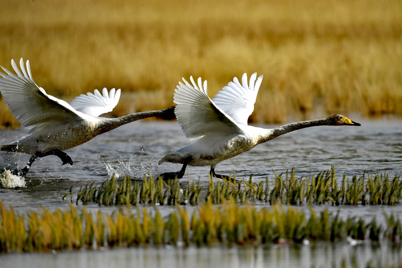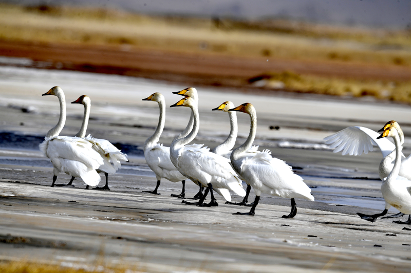 深秋时节,在甘肃盐池湾国家级自然保护区内,斑头雁、大天鹅、反嘴鹬等珍稀鸟类在湿地水域间游弋觅食、振翅翱翔,为深秋的高原湿地增添了灵动生机。近年来,当地持续加大生态环境保护力度,生物多样性保护成效显著。(张娅妮 色拥军)