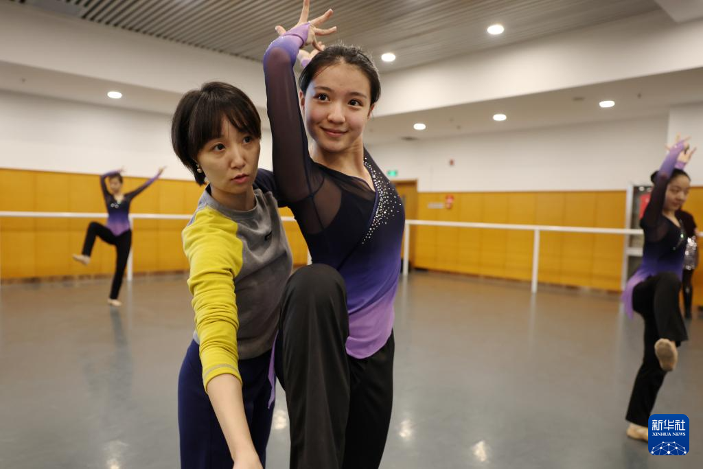 新版《丝路花雨》英娘扮演者康琦(右一)在甘肃省歌舞剧院排练厅排练(11月3日摄)。新华社记者 陈斌 摄