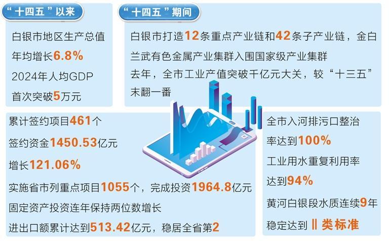记者从4日上午甘肃省政府新闻办召开的“决胜收官‘十四五’ 争先进位话发展”主题系列新闻发布会上获悉,“十四五”以来,白银市坚持“工业强市、创新发展,在落实黄河国家战略中实现新突破”的发展思路,全力打造全省现代工业产业集聚地、沿黄现代农业发展高地、黄河生态保护治理示范地和兰白经济圈协同发展重要增长极“三地一极”发展格局,全市地区生产总值年均增长6.8%,2024年人均GDP首次突破5万元;今年前三季度,全市地区生产总值增长7%,增速位居全省第三。
