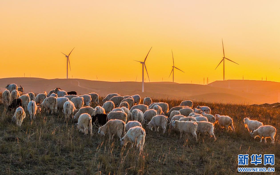 近日,甘肃省庆阳市环县毛井镇的山顶上,成排的光伏发电板和风力发电机组在落日的映衬下遥相呼应,与身披霞光的羊群构成了一幅乡村晚霞图。