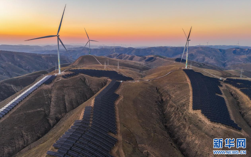 黄土高原上,漫山遍野的光伏发电板和风力发电机组,与晚霞遥相呼应。新华网发(陈坤摄)