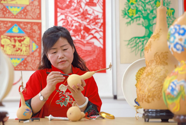 掐丝珐琅艺人李润萍正在制作葫芦珐琅作品