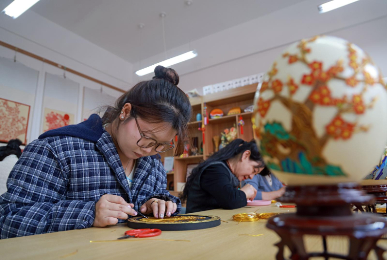 掐丝珐琅艺人李润萍指导居民制作工艺品