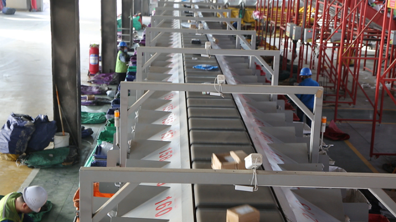 大型快递分拣流水线上,带有数字标识的分拣格口和传送带将快递精准分拣