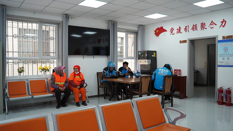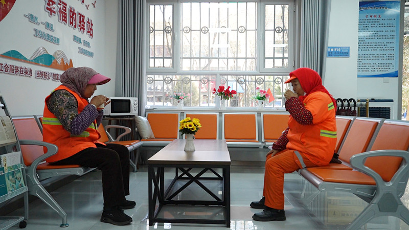 冬日的下午,外面寒风凛冽,交通局旁边的劳动者驿站里却暖意融融,环卫工人牛志茹和同事捧着热乎的茶水,聊着最近的收获。这个温馨的空间是他们奔波途中的“充电站”。