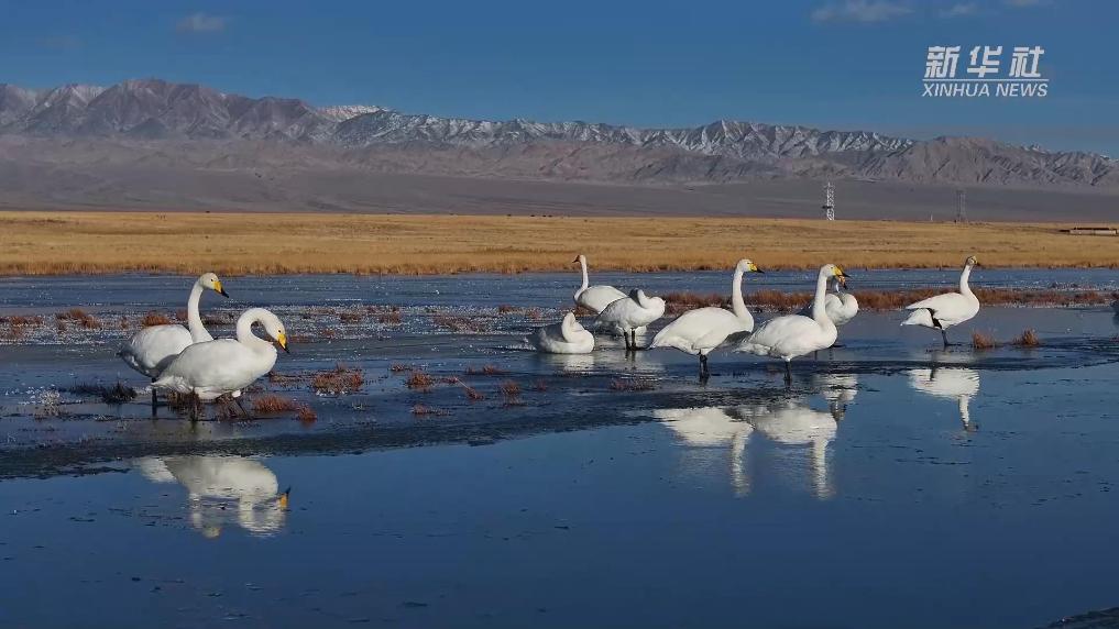 在尚未完全封冻的水域中,成群的大天鹅游弋觅食,为即将开始的南迁之旅积蓄能量。它们洁白的身姿与澄澈的冰湖、金黄的草原以及远处皑皑雪山相映成趣,共同构成一幅动人的冬日湿地生态画卷。