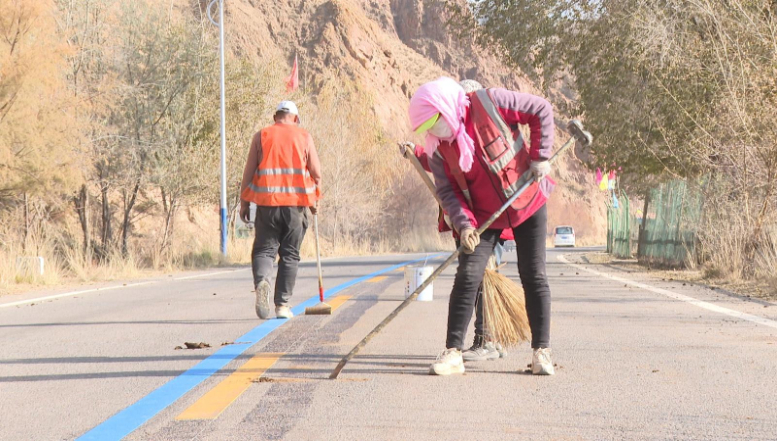 初冬时节,永昌县金川东村至毛卜喇村旅游道路上,阳光洒在沥青路面上泛着温润的光泽,道路旁的白杨树随风轻晃,远处圣容寺的金顶隐约与施工场景相映。5名身着工作服的施工人员早已各就其位,各司其职。热熔划线机的轰鸣声打破了乡村的宁静,一场为旅游公路“增色添彩”的施工作业正有序推进中……