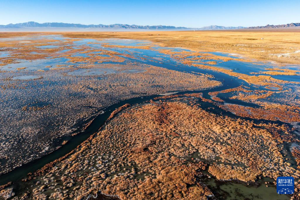 这是11月14日在河西走廊西端的甘肃省阿克塞县小苏干湖湿地拍摄的一片水域(无人机照片)。新华社记者 郎兵兵 摄