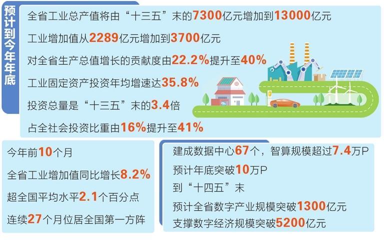 记者从省政府新闻办11月26日下午召开的“决胜收官‘十四五’ 争先进位话发展”主题系列新闻发布会上获悉,预计到今年年底,全省工业总产值将由“十三五”末的7300亿元增加到13000亿元,工业增加值从2289亿元增加到3700亿元,对全省生产总值增长的贡献度由22.2%提升至40%;工业固定资产投资年均增速达35.8%,投资总量是“十三五”末的3.4倍,占全社会投资比重由16%提升至41%,成为拉动全社会投资和支撑工业增长的重要力量,工业经济“稳定器”“压舱石”作用更加凸显。