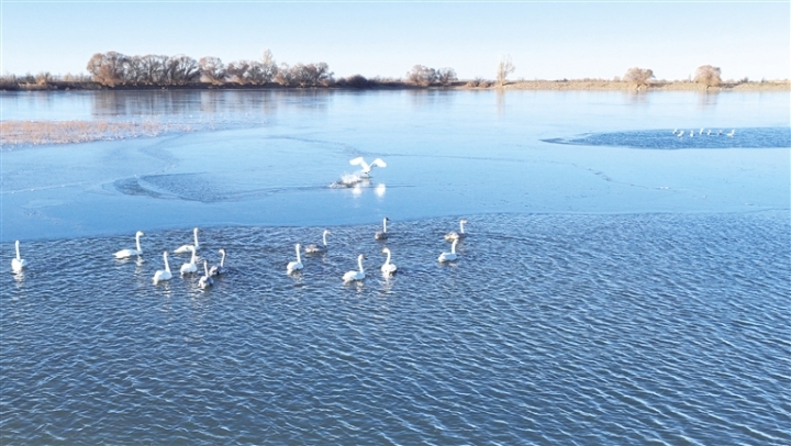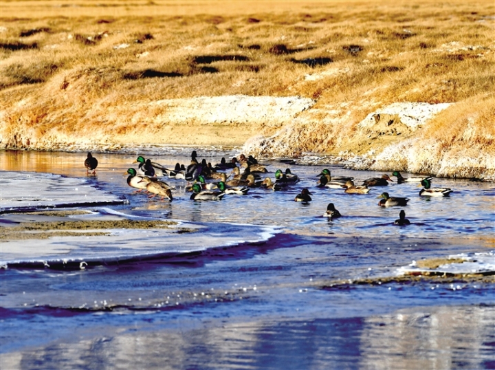 玉门赤金峡,黑鹳翩跹而至;金塔黑河边,天鹅翩然游弋;甘肃盐池湾国家级自然保护区,绿头鸭破冰嬉戏……