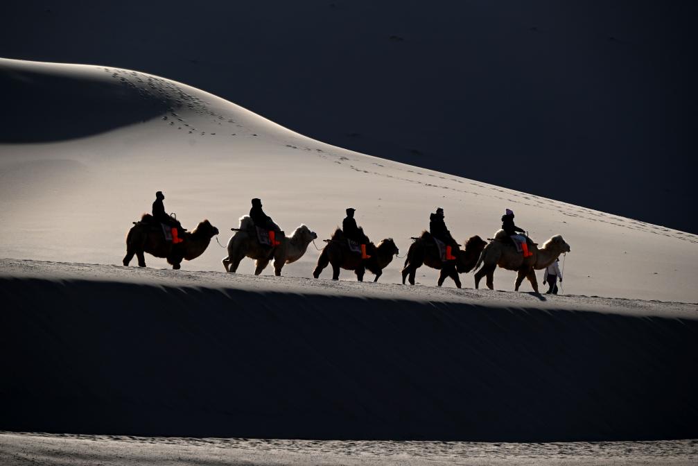 12月1日,游客在甘肃省敦煌市鸣沙山月牙泉景区游览。新华社发(张晓亮 摄)