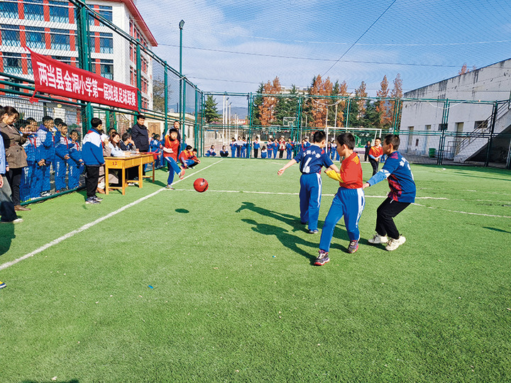 在甘肃省两当县金洞小学的操场上,学生们正在进行班级足球联赛(2023 年 11 月 13 日摄) 受访单位供图