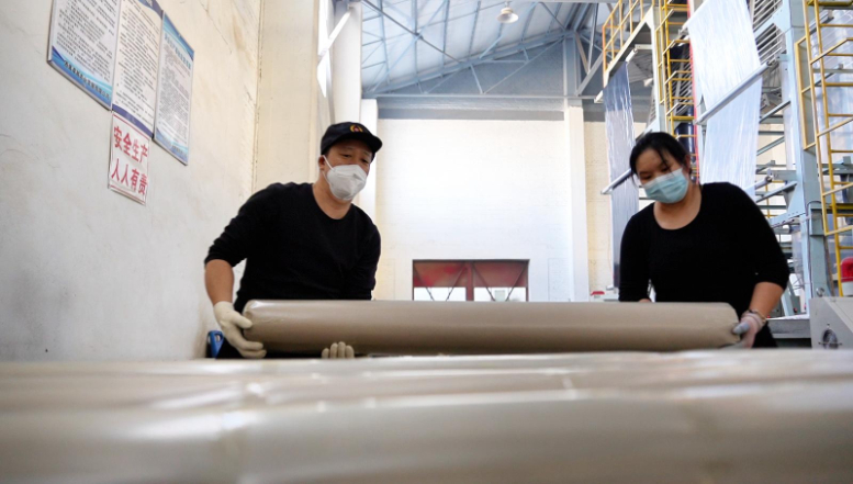 在金塔县民富地膜厂的地膜生产车间里,3条吹塑生产线高速运转,机器轰鸣声此起彼伏。8米高的吹膜口处,优质农用薄膜如白色瀑布般“喷涌”而出,自上而下均匀缠绕在卷筒上;工人们娴熟穿梭,收卷、称重、包装等工序衔接流畅,一卷卷检验合格的地膜被整齐码放成垛,静待发往田间地头。