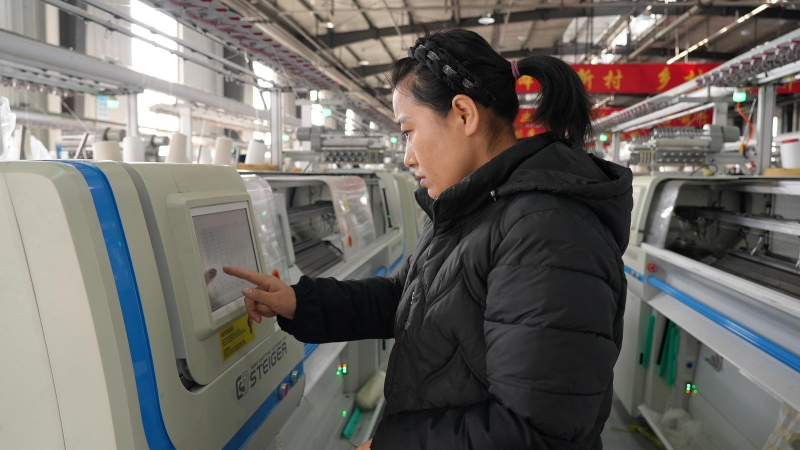 在永靖县思琳服饰有限公司,工人胥亨霞正在检查编织机的运行情况。一个月前,她通过永靖县零工市场精准匹配到了工作岗位,现如今已经能够熟练操作机器,与工友们打成一片。