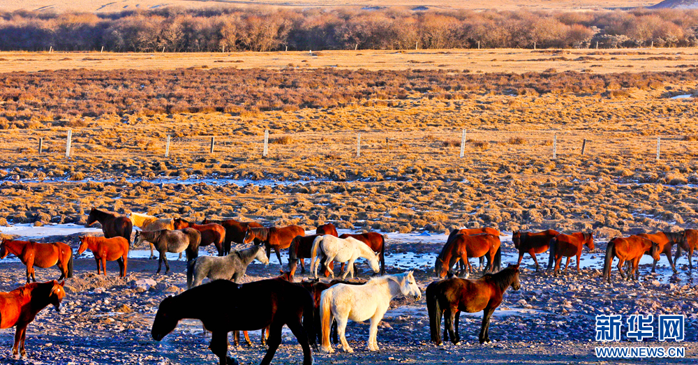 冬日里,在祁连山北麓的山丹马场,成群的骏马在金色的草原上安静觅食,犹如一幅美丽画卷。新华网发(王将 摄)