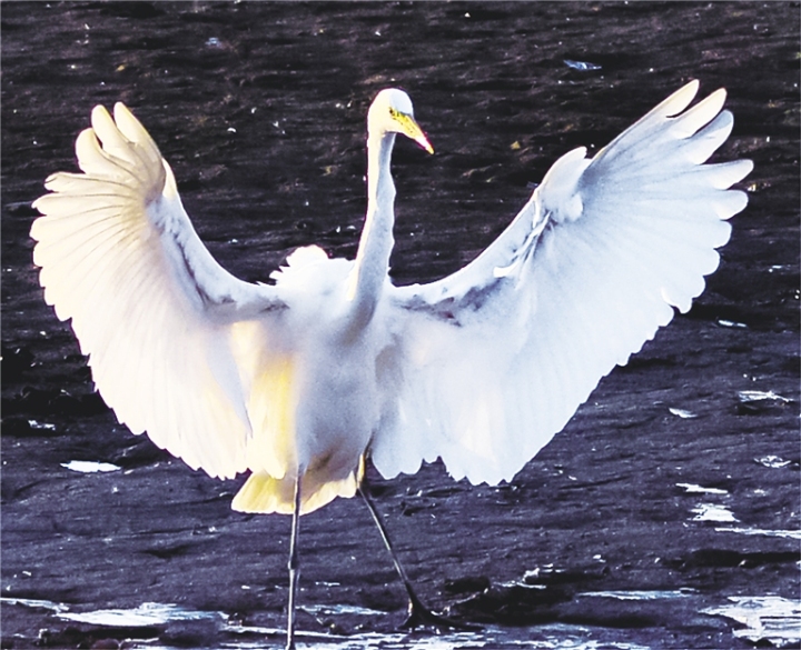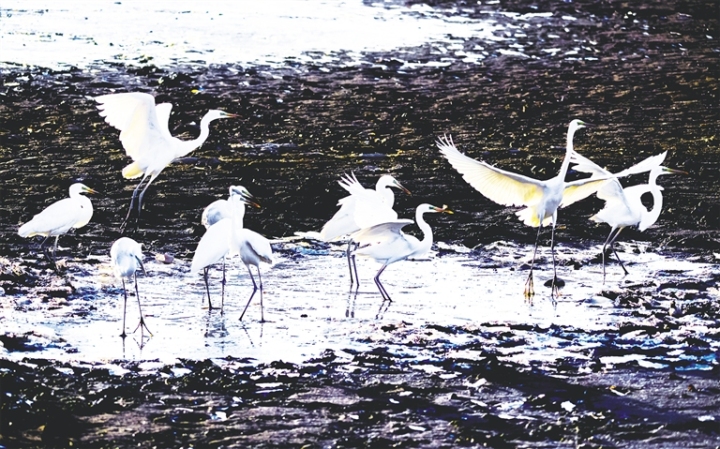 初冬的敦煌,党河两岸覆霜,水洼凝冰。一群白鹭翩然而至,翅尖掠光,如云低舞。它们时而展翅盘旋,时而轻探冰水觅食,或嬉戏或独立,为素净的党河增添灵动生机。(王斌银 周玉玲)