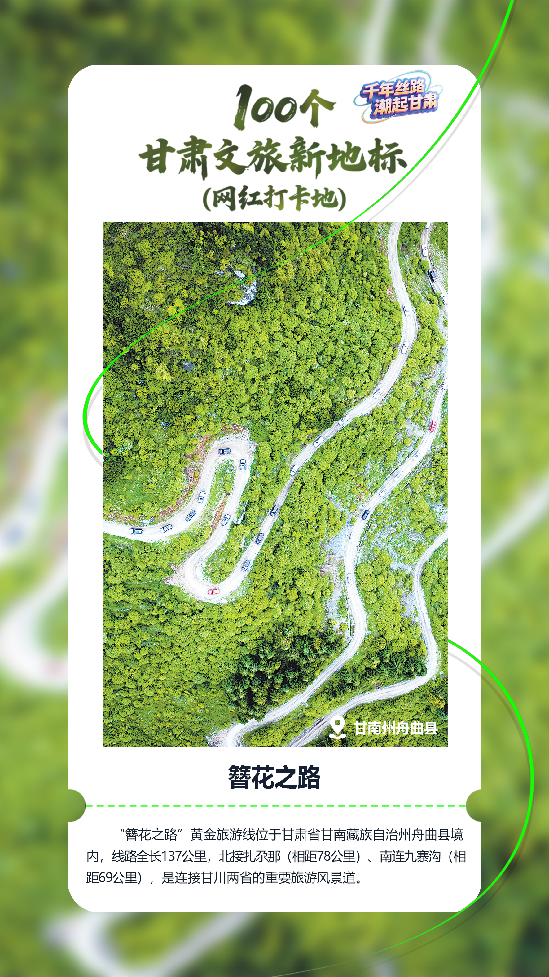 近日,在甘肃省文化和旅游厅主办的“千年丝路·潮起甘肃——100个甘肃文旅新地标(网红打卡地)”专场发布活动中,甘南州舟曲县“簪花之路”成功入选,成为展示甘肃地域特色与丝路文化内涵的重要文旅名片。