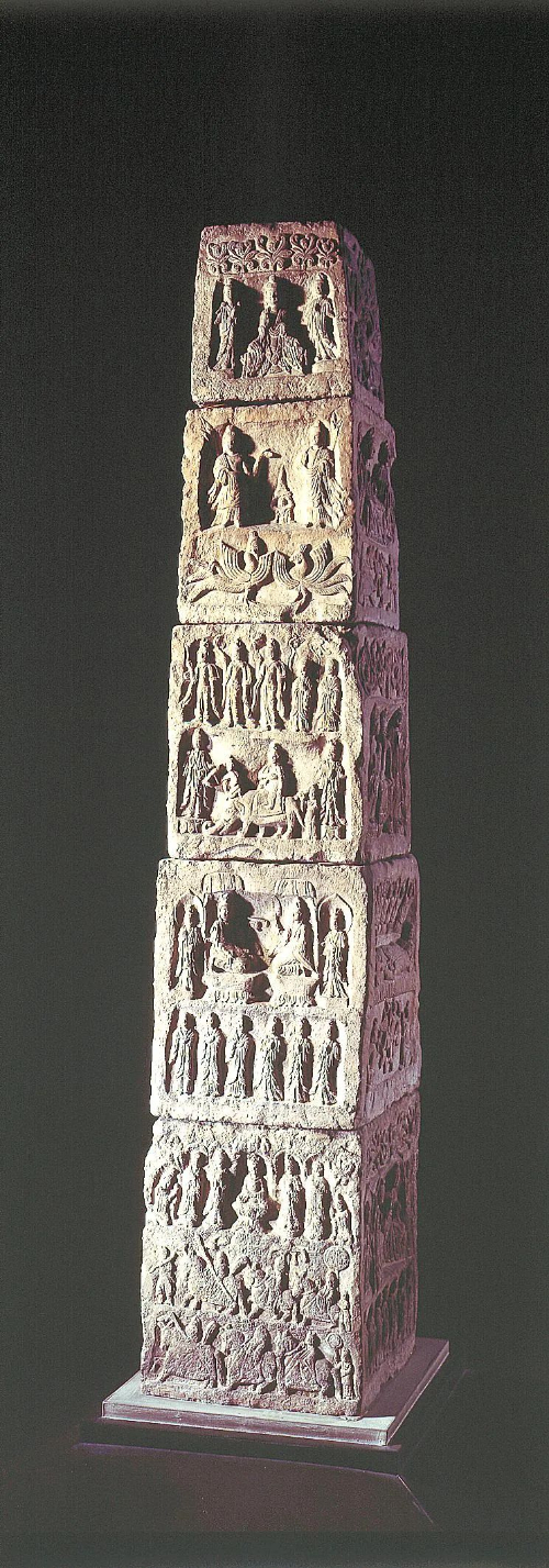 卜氏石像造塔(北魏),现藏于甘肃省博物馆,此塔虽已散失,但残存塔体上的佛传故事浮雕(如:“乘象入胎”“逾城出家”)人物形象仍带有明显的犍陀罗艺术风格。