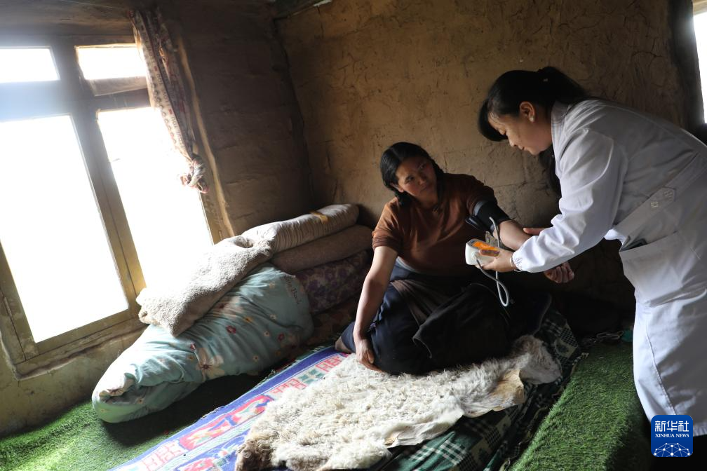 王蒋艳为牧民索南草测量血压。新华社记者 梁军 摄