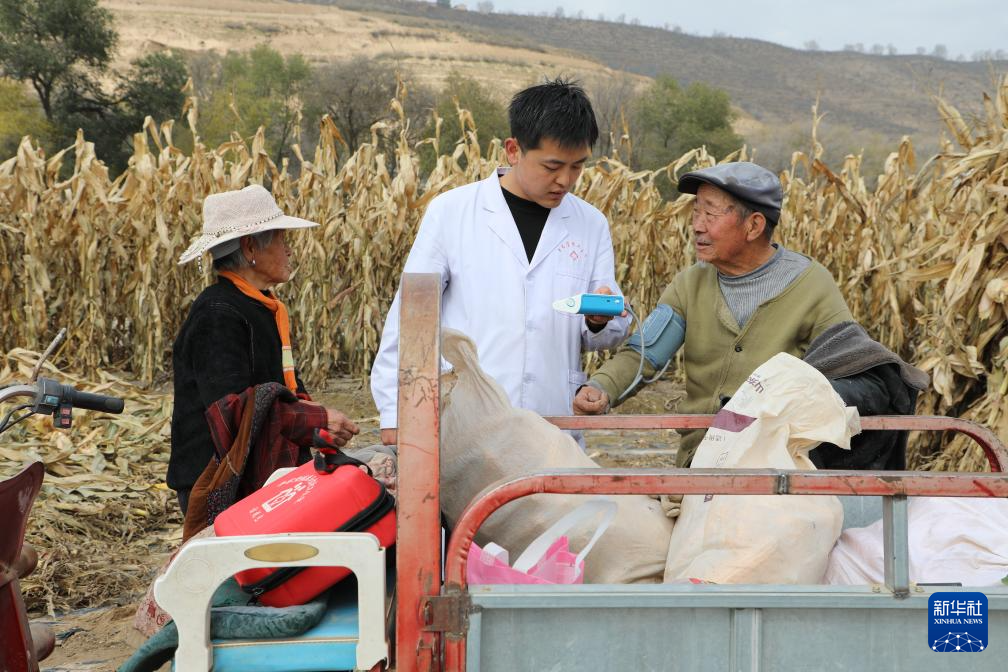 冬日照耀下,一对农家夫妻席地坐在田地里掰玉米。正在走村入户的王鑫,跨步跃上田埂,缓缓走上前,打开行医箱,就地给老乡测量血压。