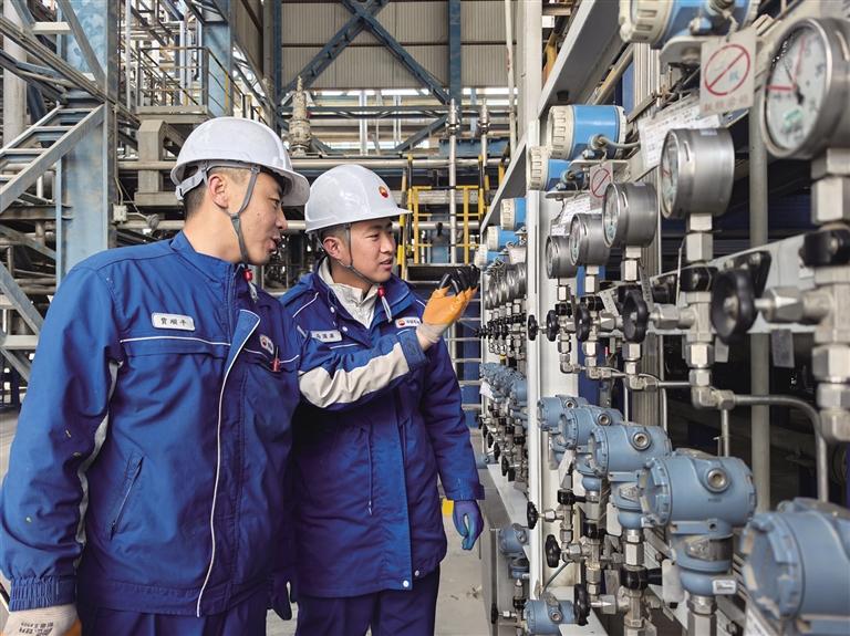 马国梁(右)和贾顺平巡检聚乙烯装置