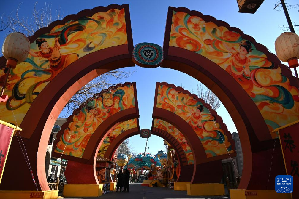 这是12月28日在敦煌夜市拍摄的特色花灯安装现场。新华社发(张晓亮 摄)