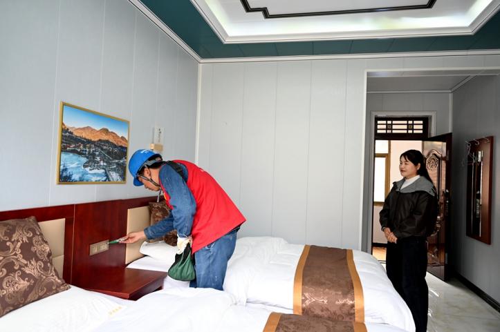 “空调、电热水器同时启动会不会跳闸?”在鹿仁村俊清客栈内,老板苗俊清向上门巡检的队员问道。服务队成员随即对客栈配电箱、厨房线路、客房插座等进行全面“体检”,用专业仪器检测线路负载情况,并为其讲解错峰用电技巧和电气火灾预防等实用知识。