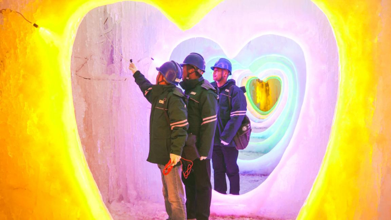 景区里,供电公司工作人员忙着检查冰雕展区的灯光设备,商户们则整理货架,一派忙碌景象。这些身影中,不少是周边村庄的村民。“景区运营起来后,我就在这儿做检票工作,一个月能挣3000块左右,不用外出打工,还能照顾家里。”附近村庄的赵大姐笑着说道。据景区负责人介绍,景区直接带动周边上百名村民实现家门口就业,岗位涵盖保洁、安保、服务接待等,稳稳托起了大家的“饭碗”。