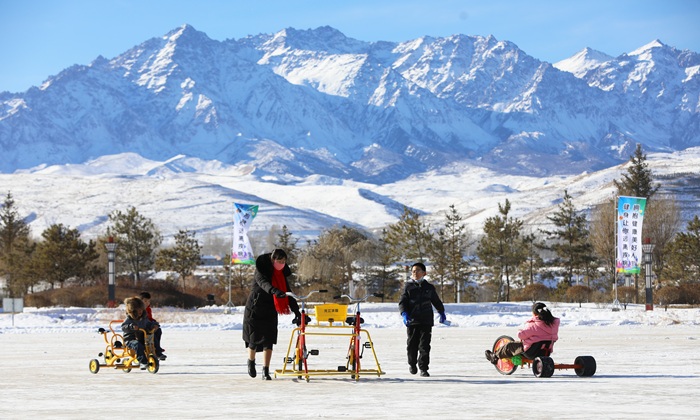 1月8日,甘肃省张掖市民乐县第三届“冰雪嘉年华”暨冬春季全域旅游推广活动。游客们纷纷在冰雪乐园畅玩冰上自行车、充气碰碰球、亲子雪圈等冰雪娱乐项目,尽情感受冰雪运动带来的快乐和趣味。