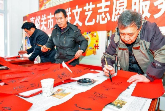 市文联书法爱好者为村民现场书写春联