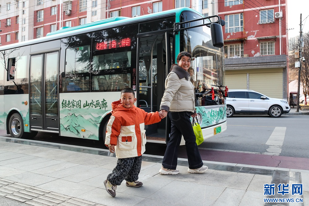 1月17日,在甘肃省陇南市两当县,祖孙二人乘坐免费公交到站后手牵手回家。新华社记者 郎兵兵 摄