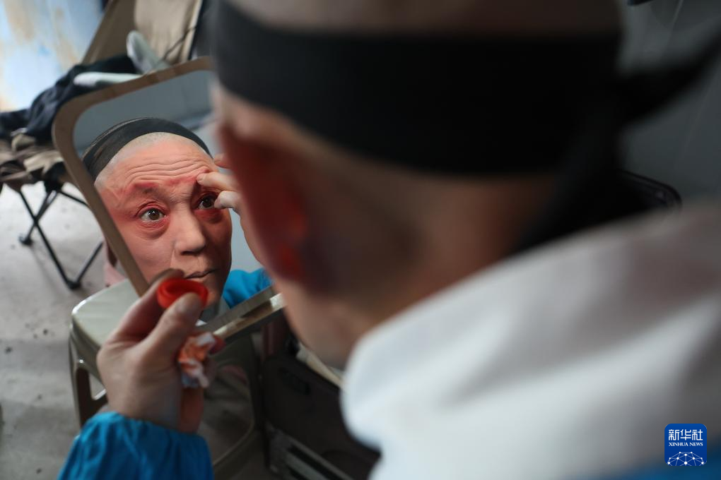 秦腔演员在年货大集上为演出做准备(1月19日摄)。新华社记者 陈斌 摄