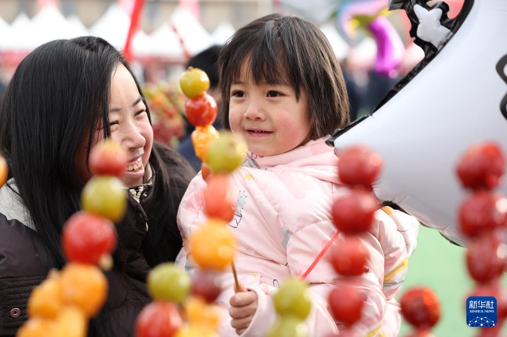 家长和孩子在年货大集上挑选糖葫芦(1月19日摄)。新华社记者 陈斌 摄