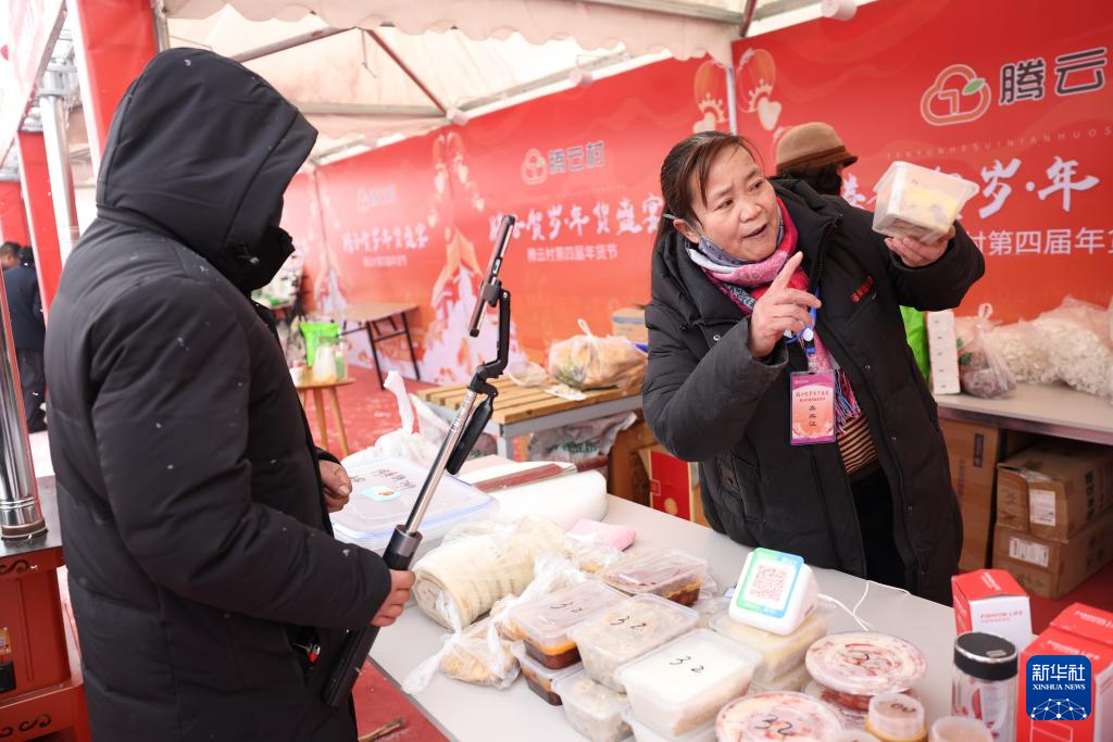一位摊主在年货大集上和自媒体博主一起推介当地特色农产品(1月19日摄)。新华社发(王克贤 摄)