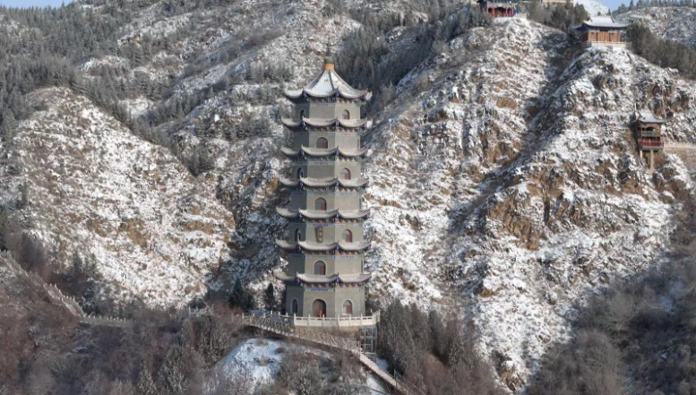 飞雪悄然,却把苍茫天地晕染成一幅淡墨长卷。远处的武当山褪去了往日的苍翠,静默成一幅晕染开的素卷,旁边的松树裹霜披玉,白雪缀满枝头,微风拂过,松枝轻轻晃动,晕染开冬日独有的素净雅致。山道间,朱红的宫墙与青灰的黛瓦,在皑皑白雪的映衬下,勾勒出温润而古朴的轮廓,偶尔有游人裹紧衣衫踏雪而过,脚下咯吱作响,身后留下一串浅浅的印痕,在空旷的山间格外醒目。
