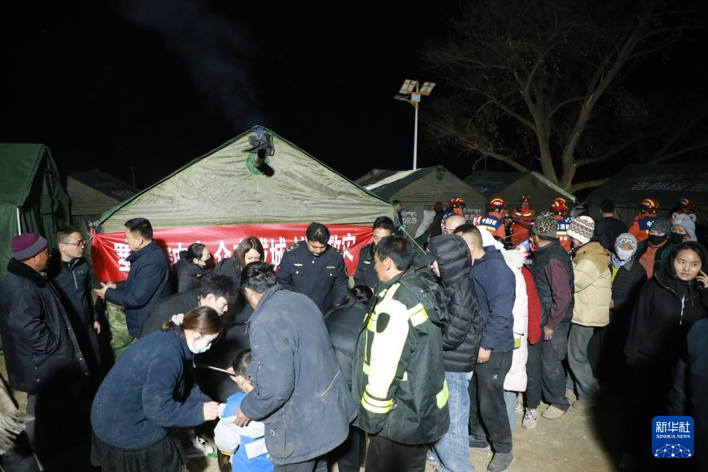 1月26日晚,在甘南州迭部县电尕镇哇曲村临时安置点,群众排队领取爱心餐。新华社记者 张智敏 摄