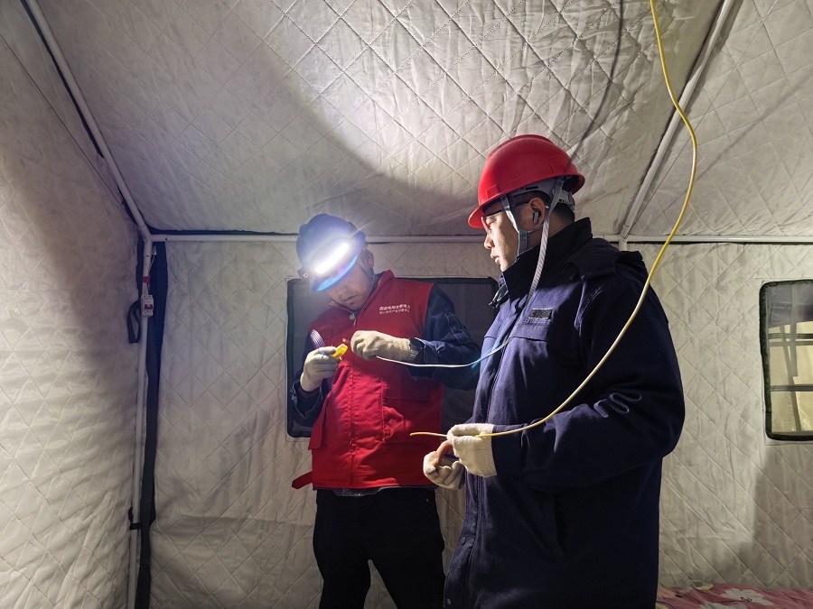 1月26日22时50分许,在甘肃省甘南州迭部县益哇镇亚日村,国网甘肃电力工作人员冒着严寒连夜奋战,为临时应急帐篷接通电源。 (杨凯 摄)